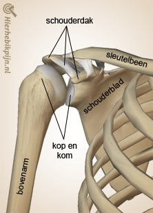 The bones located in the shoulder are the shoulder blade (scapula), the upper arm bone (humerus), and the collarbone (clavicle). The shoulder blade contains a socket in which the head of the upper arm moves. Together, the upper arm and the shoulder blade form the 'glenohumeral' joint. Above this joint lies the shoulder roof. The shoulder roof consists of bone parts of the shoulder blade and several ligament-like bands (ligaments).
